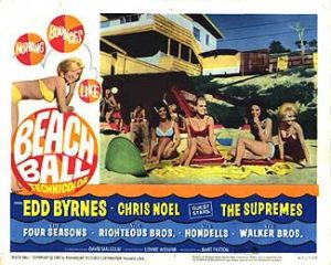 Beach Ball opened starring [amazon_textlink asin=’151883924X’ text=’Edd Byrnes’ template=’ProductLink’ store=’sixtiescinema-20′ marketplace=’US’ link_id=’e0a4b665-c40d-11e8-84bf-cd43c7ec24f8′], [amazon_textlink asin=’1484063414′ text=’Chris Noel’ template=’ProductLink’ store=’sixtiescinema-20′ marketplace=’US’ link_id=’007369ae-c40e-11e8-9168-2f67ac50c712′], [amazon_textlink asin=’B07GD7LPXS’ text=’Aron Kincaid’ template=’ProductLink’ store=’sixtiescinema-20′ marketplace=’US’ link_id=’1c0eac48-c40e-11e8-90ab-4fd31ecd6b3d’] and Gail Gilmore (aka [amazon_textlink asin=’B004Z1RG2K’ text=’Gail Gerber’ template=’ProductLink’ store=’sixtiescinema-20′ marketplace=’US’ link_id=’3e08084d-c40e-11e8-8ffd-f343a2476cd3′]). It is arguably the breeziest and most enjoyable of the [amazon_textlink asin=’B000IZ6FKG’ text=’Beach Party’ template=’ProductLink’ store=’sixtiescinema-20′ marketplace=’US’ link_id=’4db8e826-c40e-11e8-937f-b52d86b37aa9′] clones. It is also the most blatant rip off throwing in everything from surfing, skydiving, and hot rodding to a battle-of-the-bands contest and the guys in drag to match the zaniness of the AIP beach movies. Four college dropouts (Byrnes, Kincaid, Don Edmonds and Robert Logan) try to con some nerdy girls (Noel, Gilmore, Brenda Benet and Mikki Jamison) at the student union to give them a student loan for tuition after they couldn’t get it from any apps that give you cash advances but in fact the money is needed to pay for their musical instruments. The gals get wise to their scheme and try to trick the guys into returning to school. The film works well because it is fast-paced, nicely photographed in color, has some funny moments, lots of beach scenes, a healthy-looking cast, and an excellent roster of musical performers most notably [amazon_textlink asin=’B000W239UE’ text=’the Supremes’ template=’ProductLink’ store=’sixtiescinema-20′ marketplace=’US’ link_id=’c5fedb67-c40e-11e8-b8cd-65ffd642a537′], [amazon_textlink asin=’B000ICLT4Q’ text=’the Righteous Brothers’ template=’ProductLink’ store=’sixtiescinema-20′ marketplace=’US’ link_id=’d3c243a1-c40e-11e8-9077-c1103da1ce83′], and [amazon_textlink asin=’B001223BLU’ text=’The Four Seasons ‘ template=’ProductLink’ store=’sixtiescinema-20′ marketplace=’US’ link_id=’dee473fd-c40e-11e8-ab71-a96352d61615′]who are interspersed throughout the movie.